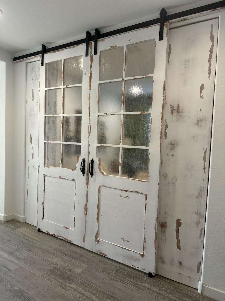 Distressed French 8-Lite Barn Door Set With Raised Panel Base