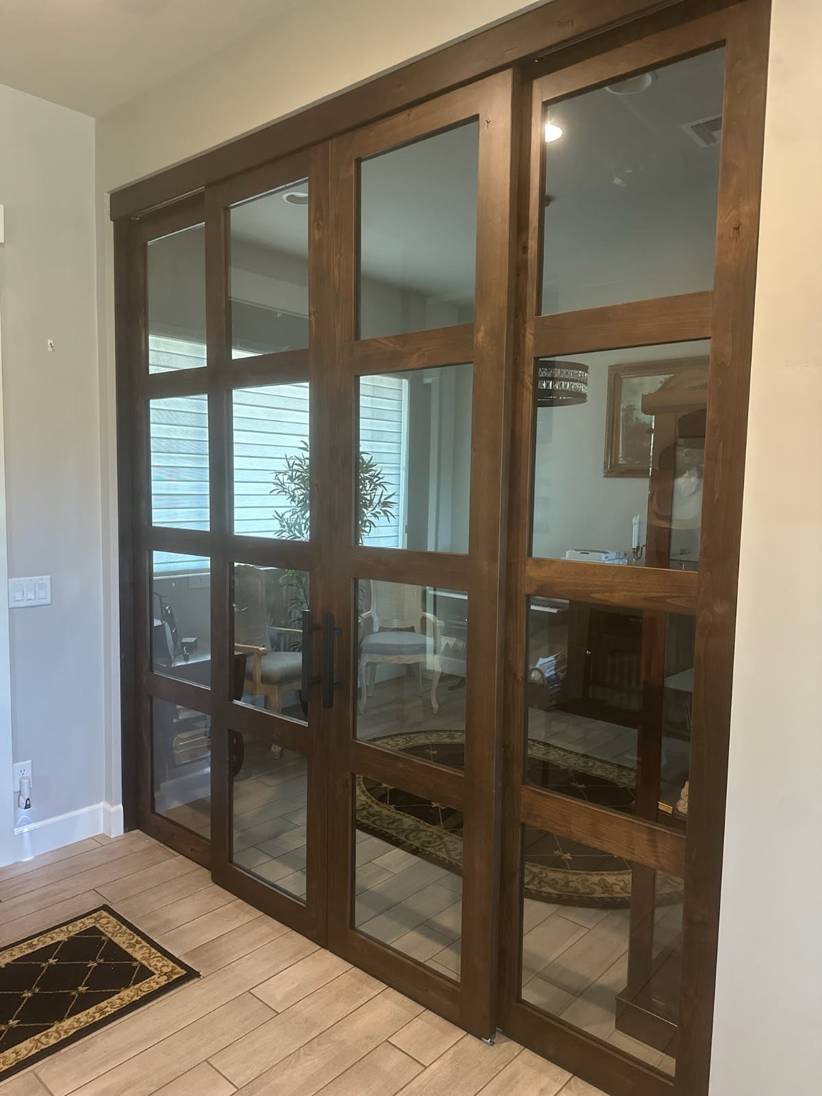 Large 8-Lite Clear Glass Barn Door Set In Stained Wood
